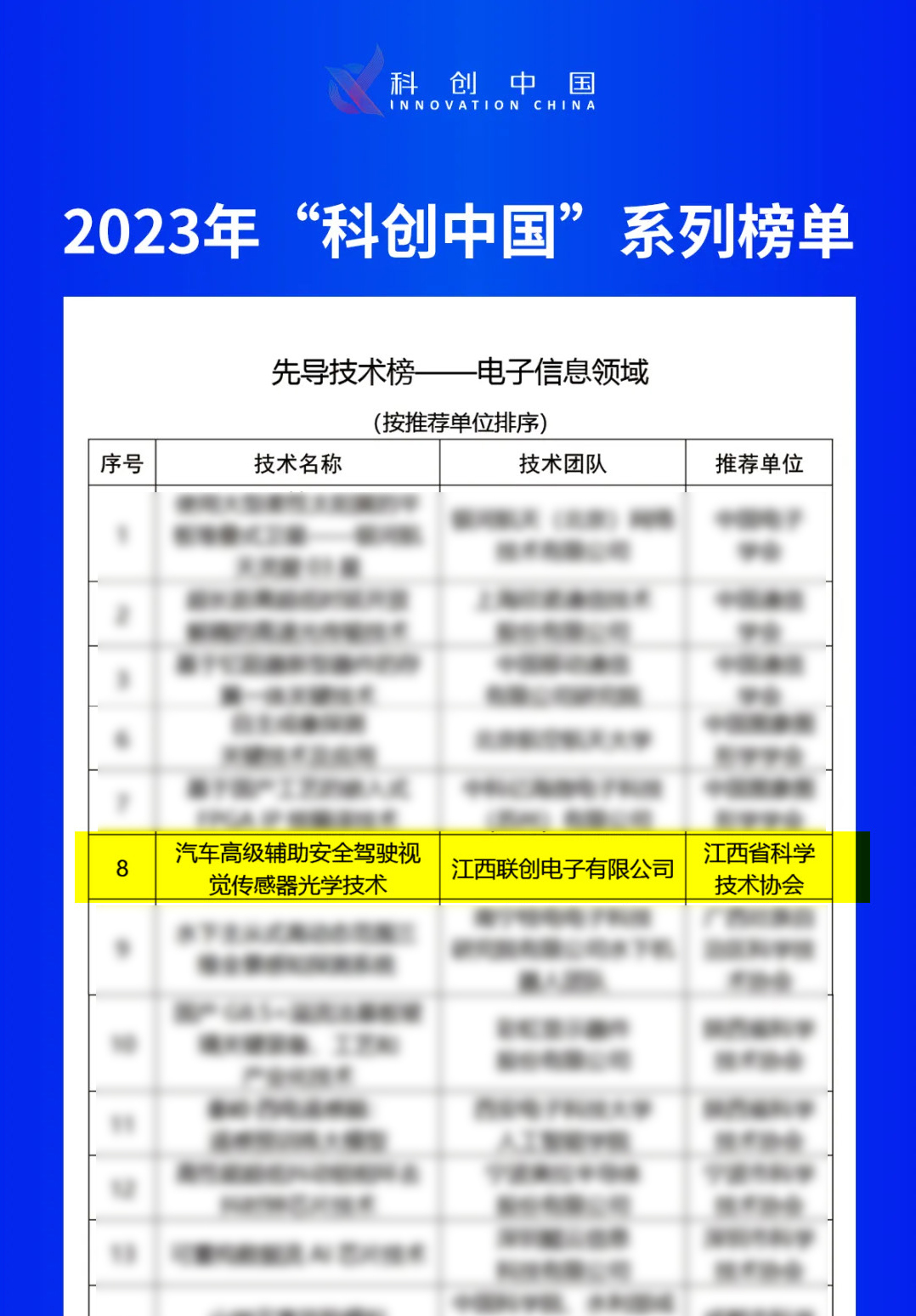 近日,中国科学技术协会公布了2023年度“科创中国”系列榜单遴选结果,江西联创电子有限公司的“汽车高级辅助安全驾驶视觉传感器光学技术”成功入选电子信息领域先导技术榜。